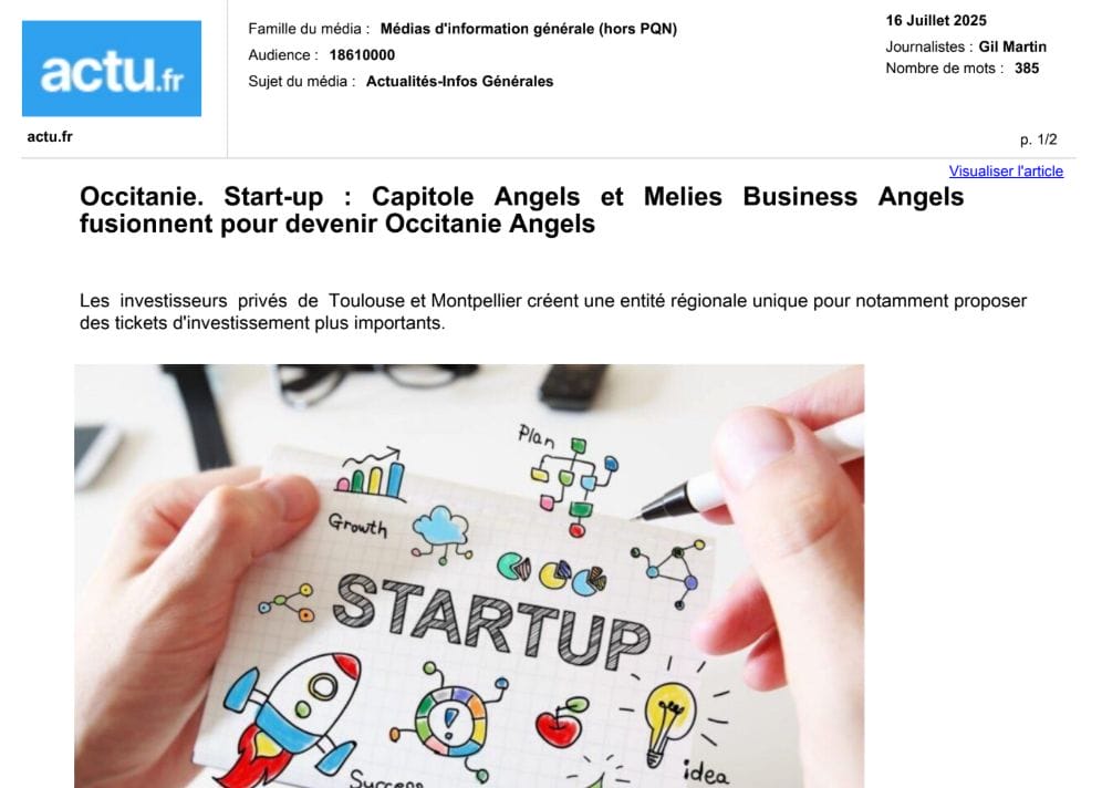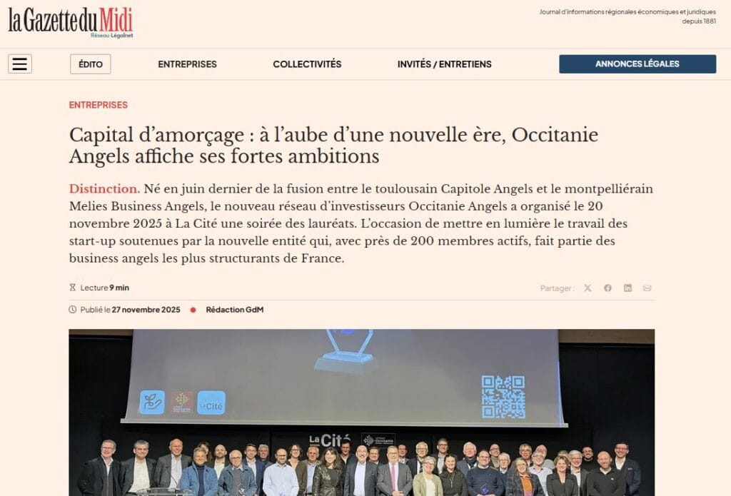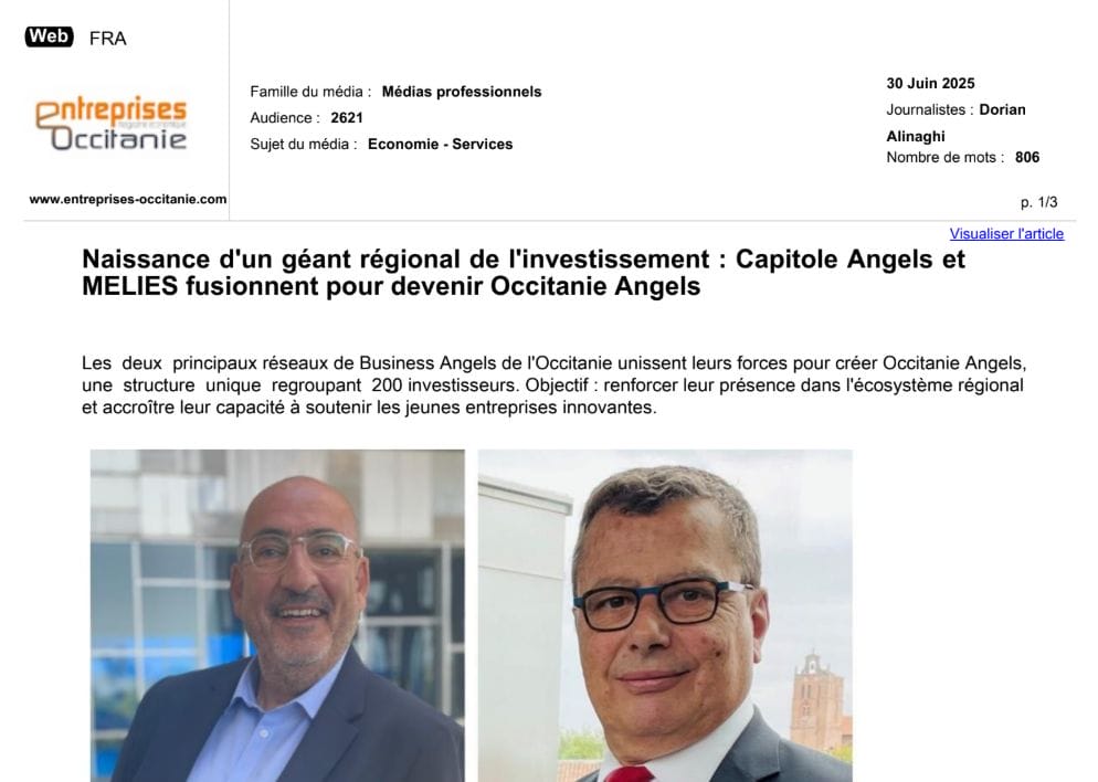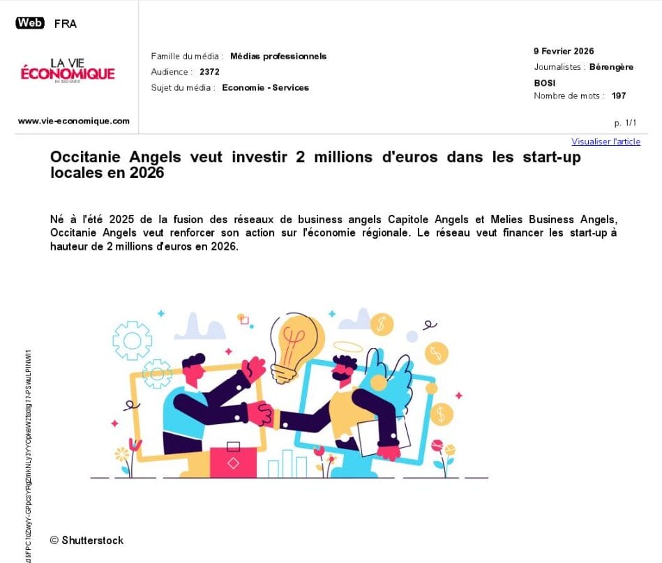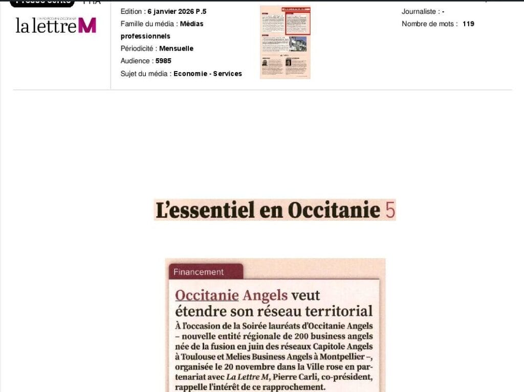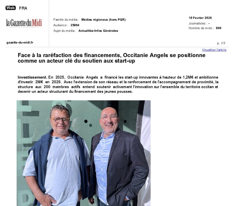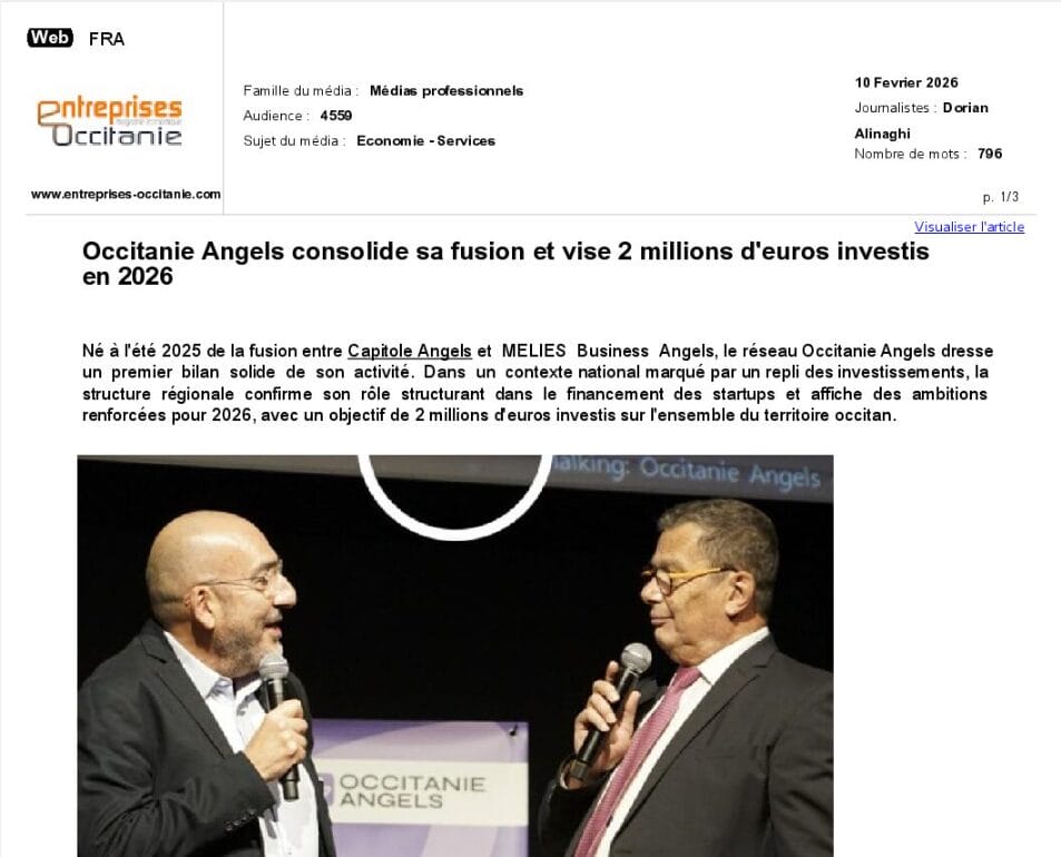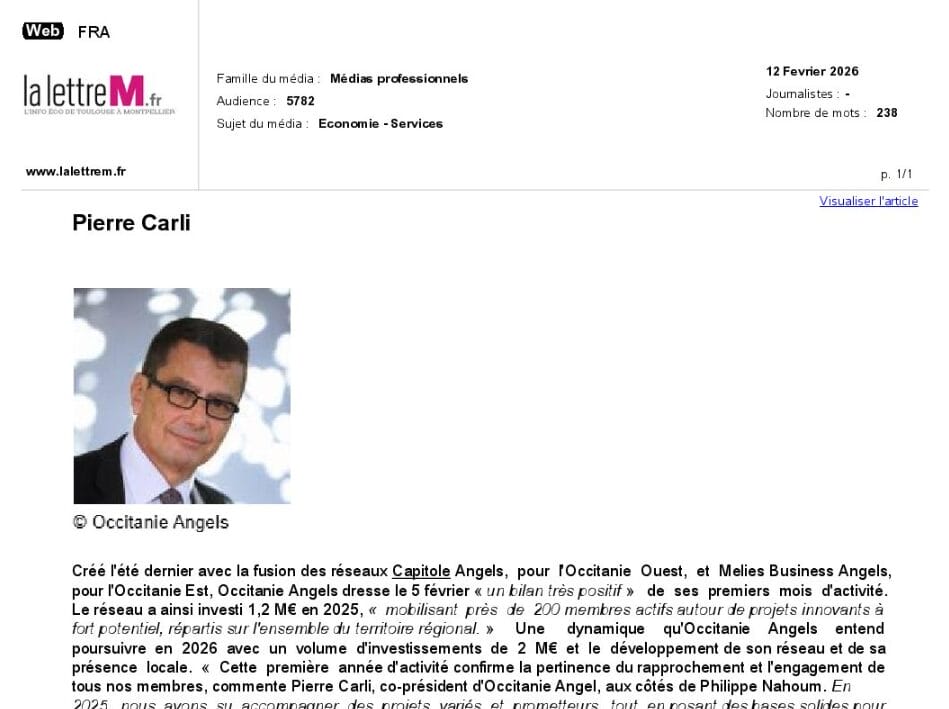 La presse parle de nous Le 19/03/2026 - Aerospace Angels vise le cap des 100 membres en 2027 - La lettre M Le 03/03/2026 - Philippe Nahoum (Occitanie Angels) passe au shaker à ID - La lettre M Le 22/02/2026 - Occitanie Angels veut investir plus et mieux dans les jeunes pousses régionales - Touléco Le 12/02/2026 - Pierre Carli - La Lettre M Le 10/02/2026 - Face à la raréfaction des financements, Occitanie Angels se positionne comme un acteur clé du soutien aux startups - la Gazette du Midi Le 10/02/2026 - Occitanie Angels consolide sa fusion et vise 2 M d'euros investis en 2026 - Entreprises Occitanie Le 09/02/2026 - Occitanie Angels veut d'investir 2 M d'euros dans les startups locales en 2026- La Vie Economique Le 06/02/2026 - Occitanie Angels prévoit d'investir 2 M d'euros en 2026 pour soutenir les startups - Le Journal des Entreprises Le 05/02/2026 - Communiqué de presse Le 15/01/2026 - Occitanie : Matinale Occitanie Angels à Béziers pour dynamiser le seed régional- MMT Le 01/2026 - Pierre Carli - La Lettre M Le 01/2026 - Philippe Nahoum - La Lettre M Le 12/01/2026 - Philippe Nahoum, Matthieu Ourliac, Occitanie Angels - Les Indiscretions Le 06/01/2026 - Edition locale du mardi 06 janvier 2026 - RCF Radio Le 04/01/2026 - Occitanie Angels veut étendre son réseau territorial - La Lettre M Le 02/01/2026 - Financement: où trouver de l'argent sans emprunter à la banque ? - TOULECO TOULOUSE Le 02/01/2026 - Occitanie Angels : startups et investisseurs réunis à Béziers autour du financement de l'innovation - Herault Tribune Le 02/01/2026 - Financement des startups - La Lettre M Le 01/01/2026 - Béziers, Matinale Business Angels à Innovosud le 6 janvier - Occitanie Tribune Le 29/12/2025 - Communiqué de Presse Le 04/12/2025 - Ça se murmure... - La Lettre M Le 27/11/2025 - Capital d’amorçage : à l’aube d’une nouvelle ère, Occitanie Angels affiche ses fortes ambitions - La Gazette du Midi Le 26/11/2025 - Occitanie Angels : les business angels gardois réunis au BIC Innov’up pour soutenir le financement de l’innovation - Le Réveil du Midi Le 25/11/2025 - L'entreprise d'Occitanie Est à l'honneur - La Lettre M Le 25/11/2025 - Matinale des Business angels à Nîmes - La Lettre M Le 25/11/2025 - « Deux startups de Haute-Garonne récompensées par les Prix Occitanie Angels – Le succès économique en Occitanie » - Entreprendre Culture Occitanie Le 25/11/2025 - L'éco d'ici, ICI Gard Lozère Le 24/11/2025 - Deux entreprises haut-garonnaises primées aux Prix Occitanie Angels - La Vie Economique Le 24/11/2025 - Occitanie Angels récompense 6 startups régionales - Le Journal des Entreprises Le 22/11/2025 - NÎMES Une matinale « Business Angels » - Objectif Gard Le 21/11/2025 - Occitanie Angels : 6 pépites de l'innovation récompensées à Toulouse - Occitanie Tribune Le 21/11/2025 - Occitanie Angels célèbre ses Lauréats 2025 et affirme son nouveau rôle régional - Entreprises Occitanie Le 21/11/2025 - Avec 200 investisseurs individuels, Occitanie Angels veut étendre son réseau territorial - La Lettre M Le 21/11/2025 - Occitanie Angels : 6 pépites de l'innovation récompensées à Toulouse - Occitanie Tribune Le 21/11/2025 - Soirée Lauréats 2025 - Communiqué de presse Matinale Business Angels - La lettre M Start-up - La Gazette de Nîmes Le 17/11/2025 - Matinale Business Angels à Nîmes le 25 novembre 2025 - Communiqué de presse Le 17/09/2025 - Béziers. APS lève 741 000 euros pour accélérer le déploiement de sa solution logicielle de pilotage industriel - Entreprises Occitanie Le 10/09/2025 - Avec ses solutions logicielles légères, APS va simplifier l'industrialisation - JDE Occitanie Le 10/09/2025 - Avec ses solutions logicielles légères, APS va simplifier l'industrialisation - Le Journal des Entreprises Le 03/09/2025 - Capitole Angels et MELIES créent Occitanie Angels - Le Journal des Entreprises Le 03/09/2025 - La start-up biterroise APS lève 700 k€ pour déployer son outil de pilotage industriel - La Lettre M Le 02/09/2025 - Communiqué de presse Occitanie Angels x APS Le 16/07/2025 - Pierre CARLI : "Occitanie. Start-up : Capitole Angels et Melies Business Angels fusionnent pour devenir Occitanie Angels" - actu.fr Le 15/07/2025 - Pierre CARLI : "Les business angels sont d'abord passionés par l'entrepreneuriat" - La Lettre M Le 01/07/2025 - Le haut garonnais Capitole Angels et le Montpelliérain MELIES fusionnent pour devenir Occitanie Angels,, basée à Montpellier - FIRST ECO Le 01/07/2025 - Occitanie Angels : Capitole Angels et MELIES fusionnent - www.vie-economique.com Le 30/06/2025 - Naissance d'un géant régional de l'investissement : Capitole Angels et MELIES fusionnent pour devenir Occitanie Angels - Entreprises Occitanie Le 30/06/2025 - Pierre Carli, Philippe Nahoum, Occitanie Angels - Les Indiscretions Le 30/06/2025 - Capitole Angels et MELIES fusionnent pour devenir Occitanie Angels - Le Journal des Entreprises Le 29/06/2025 - Naissance d'un géant régional de l'investissement : Capitole Angels et MELIES fusionnent pour devenir Occitanie Angelss - Entreprises Occitanie Le 27/06/2025 - Capitole Angels et MELIES Business Angels fusionnent pour devenir Occitanie Angels - www.tvlocale.fr Le 27/06/2025 - Communiqué de presse Occitanie Angels Le 27/05/2025 - Pierre CARLI - La Lettre M Le 25/05/2025 - Après les JO, la start-up I-Percut vise de nouveaux sommets - La Dépêche Le 22/05/2025 - Basé à Ramonville-Saint-Agne, Capitole Angels ambitionne de réaliser 700K€ d'investissements d'ici fin 2025 - First Eco Le 21/05/2025 - I-Percut boucle une levée de fonds de 300 K€ pour conquérir le marché du fitness et l'Europe - la Gazette du Midi Le 20/05/2025 - Une carte de visite connectée pour réseauter - Aujourd'hui en France Le 09/05/2025 - "C'est risqué", à Toulouse des dirigeants d'entreprises investissent dans des start-ups pour qu'elles se développent - Ici occitanie Le 09/05/2025 - WeMet. Une levée pour continuer