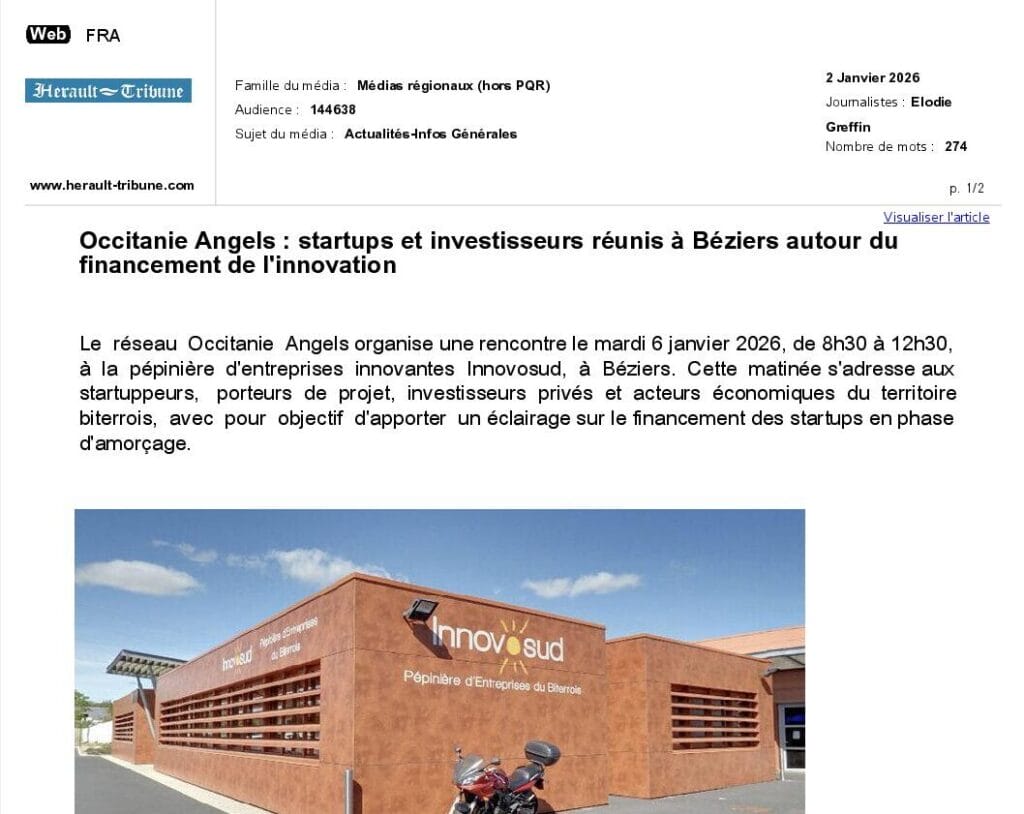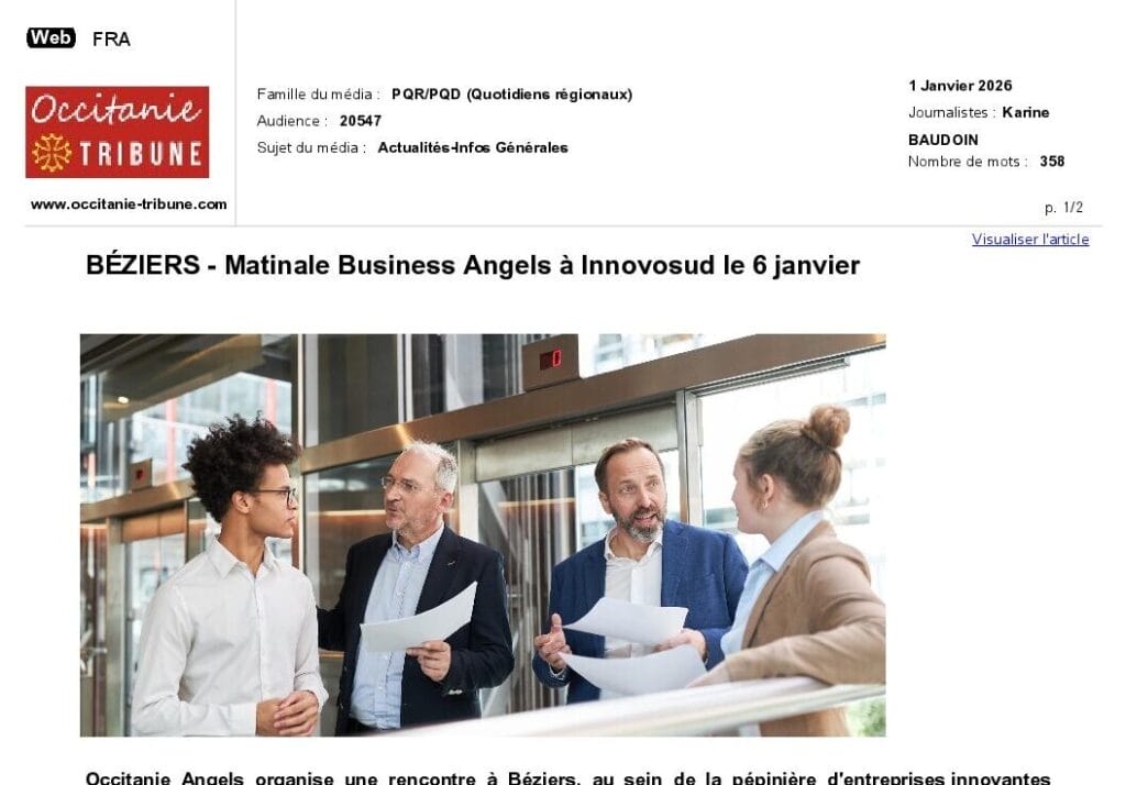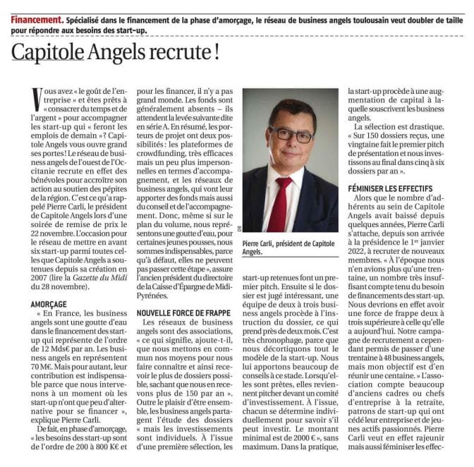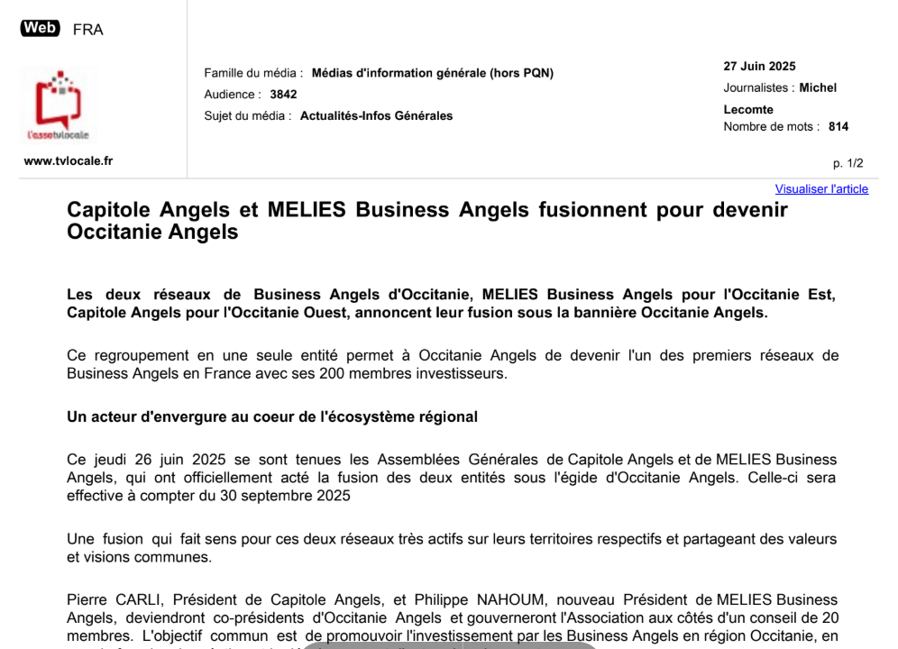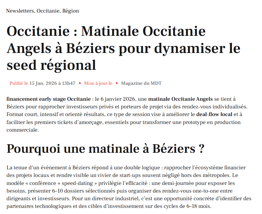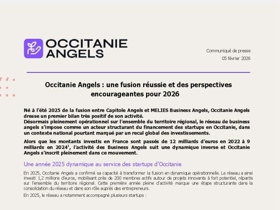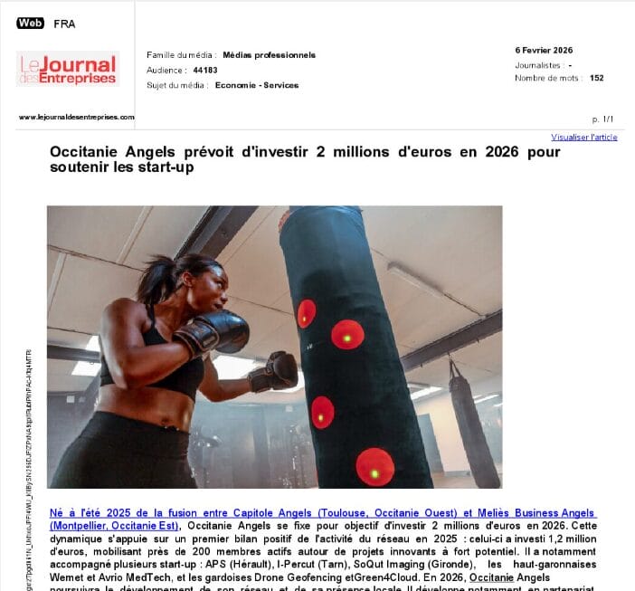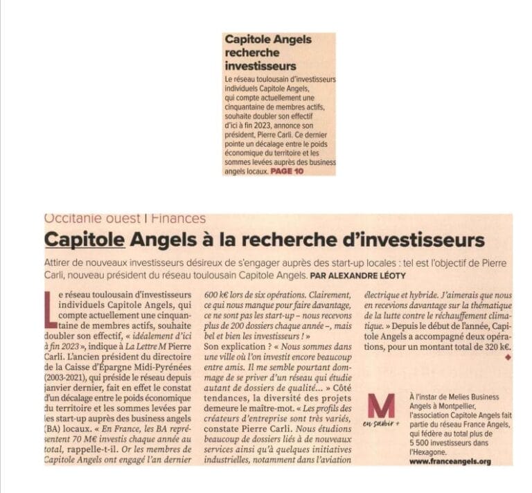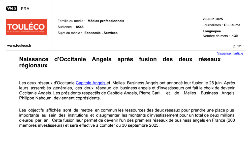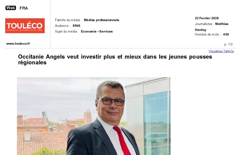 La presse parle de nous Le 19/03/2026 - Aerospace Angels vise le cap des 100 membres en 2027 - La lettre M Le 03/03/2026 - Philippe Nahoum (Occitanie Angels) passe au shaker à ID - La lettre M Le 22/02/2026 - Occitanie Angels veut investir plus et mieux dans les jeunes pousses régionales - Touléco Le 12/02/2026 - Pierre Carli - La Lettre M Le 10/02/2026 - Face à la raréfaction des financements, Occitanie Angels se positionne comme un acteur clé du soutien aux startups - la Gazette du Midi Le 10/02/2026 - Occitanie Angels consolide sa fusion et vise 2 M d'euros investis en 2026 - Entreprises Occitanie Le 09/02/2026 - Occitanie Angels veut d'investir 2 M d'euros dans les startups locales en 2026- La Vie Economique Le 06/02/2026 - Occitanie Angels prévoit d'investir 2 M d'euros en 2026 pour soutenir les startups - Le Journal des Entreprises Le 05/02/2026 - Communiqué de presse Le 15/01/2026 - Occitanie : Matinale Occitanie Angels à Béziers pour dynamiser le seed régional- MMT Le 01/2026 - Pierre Carli - La Lettre M Le 01/2026 - Philippe Nahoum - La Lettre M Le 12/01/2026 - Philippe Nahoum, Matthieu Ourliac, Occitanie Angels - Les Indiscretions Le 06/01/2026 - Edition locale du mardi 06 janvier 2026 - RCF Radio Le 04/01/2026 - Occitanie Angels veut étendre son réseau territorial - La Lettre M Le 02/01/2026 - Financement: où trouver de l'argent sans emprunter à la banque ? - TOULECO TOULOUSE Le 02/01/2026 - Occitanie Angels : startups et investisseurs réunis à Béziers autour du financement de l'innovation - Herault Tribune Le 02/01/2026 - Financement des startups - La Lettre M Le 01/01/2026 - Béziers, Matinale Business Angels à Innovosud le 6 janvier - Occitanie Tribune Le 29/12/2025 - Communiqué de Presse Le 04/12/2025 - Ça se murmure... - La Lettre M Le 27/11/2025 - Capital d’amorçage : à l’aube d’une nouvelle ère, Occitanie Angels affiche ses fortes ambitions - La Gazette du Midi Le 26/11/2025 - Occitanie Angels : les business angels gardois réunis au BIC Innov’up pour soutenir le financement de l’innovation - Le Réveil du Midi Le 25/11/2025 - L'entreprise d'Occitanie Est à l'honneur - La Lettre M Le 25/11/2025 - Matinale des Business angels à Nîmes - La Lettre M Le 25/11/2025 - « Deux startups de Haute-Garonne récompensées par les Prix Occitanie Angels – Le succès économique en Occitanie » - Entreprendre Culture Occitanie Le 25/11/2025 - L'éco d'ici, ICI Gard Lozère Le 24/11/2025 - Deux entreprises haut-garonnaises primées aux Prix Occitanie Angels - La Vie Economique Le 24/11/2025 - Occitanie Angels récompense 6 startups régionales - Le Journal des Entreprises Le 22/11/2025 - NÎMES Une matinale « Business Angels » - Objectif Gard Le 21/11/2025 - Occitanie Angels : 6 pépites de l'innovation récompensées à Toulouse - Occitanie Tribune Le 21/11/2025 - Occitanie Angels célèbre ses Lauréats 2025 et affirme son nouveau rôle régional - Entreprises Occitanie Le 21/11/2025 - Avec 200 investisseurs individuels, Occitanie Angels veut étendre son réseau territorial - La Lettre M Le 21/11/2025 - Occitanie Angels : 6 pépites de l'innovation récompensées à Toulouse - Occitanie Tribune Le 21/11/2025 - Soirée Lauréats 2025 - Communiqué de presse Matinale Business Angels - La lettre M Start-up - La Gazette de Nîmes Le 17/11/2025 - Matinale Business Angels à Nîmes le 25 novembre 2025 - Communiqué de presse Le 17/09/2025 - Béziers. APS lève 741 000 euros pour accélérer le déploiement de sa solution logicielle de pilotage industriel - Entreprises Occitanie Le 10/09/2025 - Avec ses solutions logicielles légères, APS va simplifier l'industrialisation - JDE Occitanie Le 10/09/2025 - Avec ses solutions logicielles légères, APS va simplifier l'industrialisation - Le Journal des Entreprises Le 03/09/2025 - Capitole Angels et MELIES créent Occitanie Angels - Le Journal des Entreprises Le 03/09/2025 - La start-up biterroise APS lève 700 k€ pour déployer son outil de pilotage industriel - La Lettre M Le 02/09/2025 - Communiqué de presse Occitanie Angels x APS Le 16/07/2025 - Pierre CARLI : "Occitanie. Start-up : Capitole Angels et Melies Business Angels fusionnent pour devenir Occitanie Angels" - actu.fr Le 15/07/2025 - Pierre CARLI : "Les business angels sont d'abord passionés par l'entrepreneuriat" - La Lettre M Le 01/07/2025 - Le haut garonnais Capitole Angels et le Montpelliérain MELIES fusionnent pour devenir Occitanie Angels,, basée à Montpellier - FIRST ECO Le 01/07/2025 - Occitanie Angels : Capitole Angels et MELIES fusionnent - www.vie-economique.com Le 30/06/2025 - Naissance d'un géant régional de l'investissement : Capitole Angels et MELIES fusionnent pour devenir Occitanie Angels - Entreprises Occitanie Le 30/06/2025 - Pierre Carli, Philippe Nahoum, Occitanie Angels - Les Indiscretions Le 30/06/2025 - Capitole Angels et MELIES fusionnent pour devenir Occitanie Angels - Le Journal des Entreprises Le 29/06/2025 - Naissance d'un géant régional de l'investissement : Capitole Angels et MELIES fusionnent pour devenir Occitanie Angelss - Entreprises Occitanie Le 27/06/2025 - Capitole Angels et MELIES Business Angels fusionnent pour devenir Occitanie Angels - www.tvlocale.fr Le 27/06/2025 - Communiqué de presse Occitanie Angels Le 27/05/2025 - Pierre CARLI - La Lettre M Le 25/05/2025 - Après les JO, la start-up I-Percut vise de nouveaux sommets - La Dépêche Le 22/05/2025 - Basé à Ramonville-Saint-Agne, Capitole Angels ambitionne de réaliser 700K€ d'investissements d'ici fin 2025 - First Eco Le 21/05/2025 - I-Percut boucle une levée de fonds de 300 K€ pour conquérir le marché du fitness et l'Europe - la Gazette du Midi Le 20/05/2025 - Une carte de visite connectée pour réseauter - Aujourd'hui en France Le 09/05/2025 - "C'est risqué", à Toulouse des dirigeants d'entreprises investissent dans des start-ups pour qu'elles se développent - Ici occitanie Le 09/05/2025 - WeMet. Une levée pour continuer