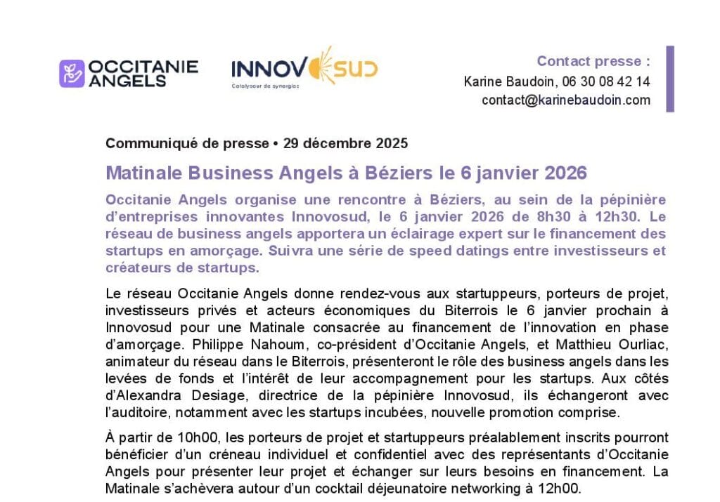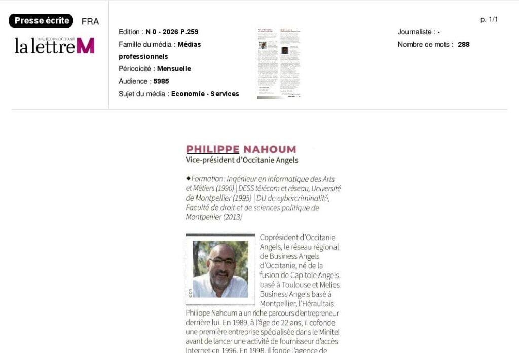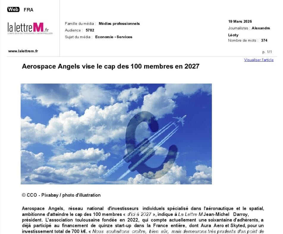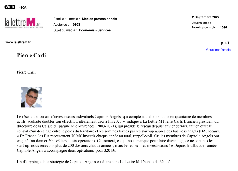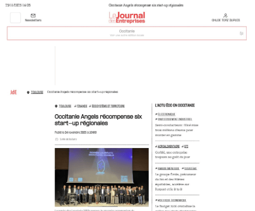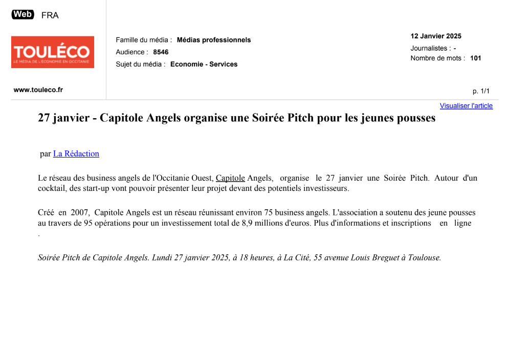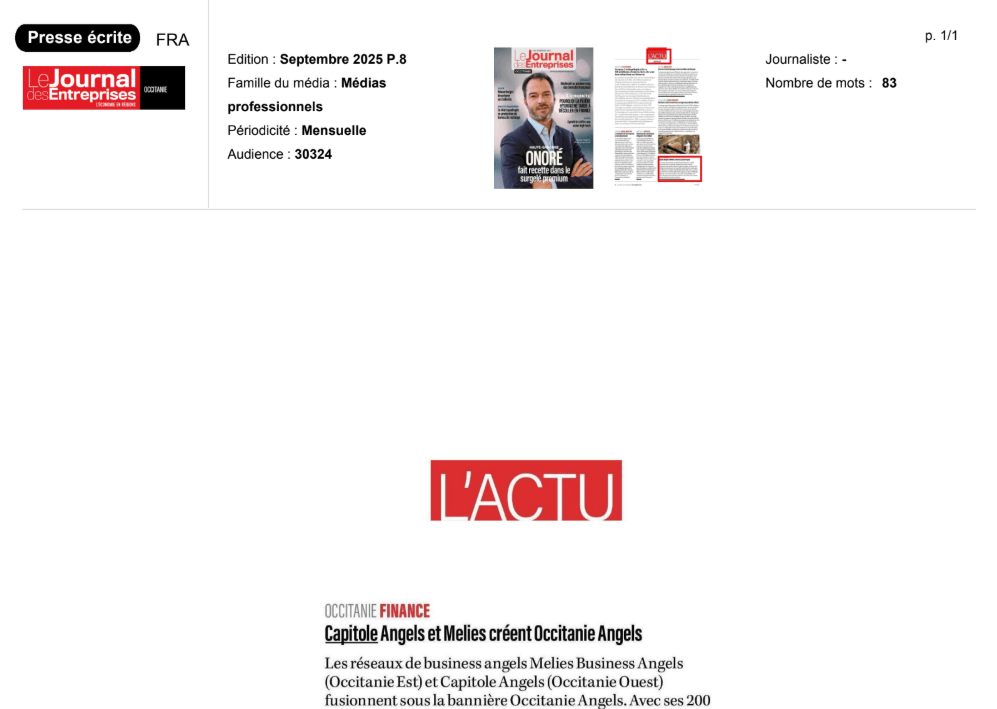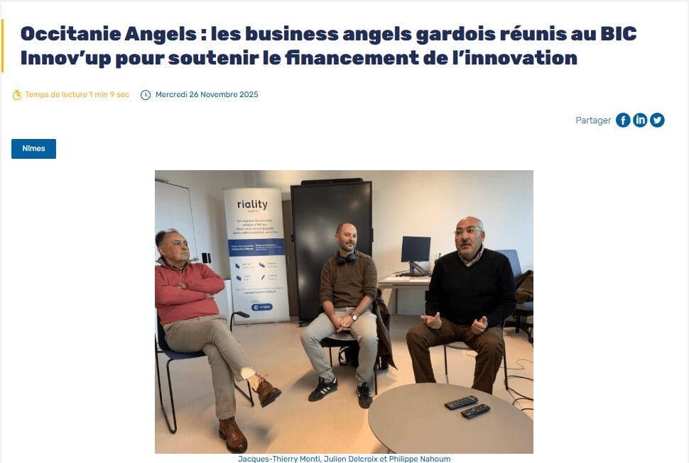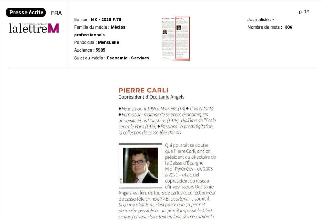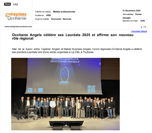 La presse parle de nous Le 19/03/2026 - Aerospace Angels vise le cap des 100 membres en 2027 - La lettre M Le 03/03/2026 - Philippe Nahoum (Occitanie Angels) passe au shaker à ID - La lettre M Le 22/02/2026 - Occitanie Angels veut investir plus et mieux dans les jeunes pousses régionales - Touléco Le 12/02/2026 - Pierre Carli - La Lettre M Le 10/02/2026 - Face à la raréfaction des financements, Occitanie Angels se positionne comme un acteur clé du soutien aux startups - la Gazette du Midi Le 10/02/2026 - Occitanie Angels consolide sa fusion et vise 2 M d'euros investis en 2026 - Entreprises Occitanie Le 09/02/2026 - Occitanie Angels veut d'investir 2 M d'euros dans les startups locales en 2026- La Vie Economique Le 06/02/2026 - Occitanie Angels prévoit d'investir 2 M d'euros en 2026 pour soutenir les startups - Le Journal des Entreprises Le 05/02/2026 - Communiqué de presse Le 15/01/2026 - Occitanie : Matinale Occitanie Angels à Béziers pour dynamiser le seed régional- MMT Le 01/2026 - Pierre Carli - La Lettre M Le 01/2026 - Philippe Nahoum - La Lettre M Le 12/01/2026 - Philippe Nahoum, Matthieu Ourliac, Occitanie Angels - Les Indiscretions Le 06/01/2026 - Edition locale du mardi 06 janvier 2026 - RCF Radio Le 04/01/2026 - Occitanie Angels veut étendre son réseau territorial - La Lettre M Le 02/01/2026 - Financement: où trouver de l'argent sans emprunter à la banque ? - TOULECO TOULOUSE Le 02/01/2026 - Occitanie Angels : startups et investisseurs réunis à Béziers autour du financement de l'innovation - Herault Tribune Le 02/01/2026 - Financement des startups - La Lettre M Le 01/01/2026 - Béziers, Matinale Business Angels à Innovosud le 6 janvier - Occitanie Tribune Le 29/12/2025 - Communiqué de Presse Le 04/12/2025 - Ça se murmure... - La Lettre M Le 27/11/2025 - Capital d’amorçage : à l’aube d’une nouvelle ère, Occitanie Angels affiche ses fortes ambitions - La Gazette du Midi Le 26/11/2025 - Occitanie Angels : les business angels gardois réunis au BIC Innov’up pour soutenir le financement de l’innovation - Le Réveil du Midi Le 25/11/2025 - L'entreprise d'Occitanie Est à l'honneur - La Lettre M Le 25/11/2025 - Matinale des Business angels à Nîmes - La Lettre M Le 25/11/2025 - « Deux startups de Haute-Garonne récompensées par les Prix Occitanie Angels – Le succès économique en Occitanie » - Entreprendre Culture Occitanie Le 25/11/2025 - L'éco d'ici, ICI Gard Lozère Le 24/11/2025 - Deux entreprises haut-garonnaises primées aux Prix Occitanie Angels - La Vie Economique Le 24/11/2025 - Occitanie Angels récompense 6 startups régionales - Le Journal des Entreprises Le 22/11/2025 - NÎMES Une matinale « Business Angels » - Objectif Gard Le 21/11/2025 - Occitanie Angels : 6 pépites de l'innovation récompensées à Toulouse - Occitanie Tribune Le 21/11/2025 - Occitanie Angels célèbre ses Lauréats 2025 et affirme son nouveau rôle régional - Entreprises Occitanie Le 21/11/2025 - Avec 200 investisseurs individuels, Occitanie Angels veut étendre son réseau territorial - La Lettre M Le 21/11/2025 - Occitanie Angels : 6 pépites de l'innovation récompensées à Toulouse - Occitanie Tribune Le 21/11/2025 - Soirée Lauréats 2025 - Communiqué de presse Matinale Business Angels - La lettre M Start-up - La Gazette de Nîmes Le 17/11/2025 - Matinale Business Angels à Nîmes le 25 novembre 2025 - Communiqué de presse Le 17/09/2025 - Béziers. APS lève 741 000 euros pour accélérer le déploiement de sa solution logicielle de pilotage industriel - Entreprises Occitanie Le 10/09/2025 - Avec ses solutions logicielles légères, APS va simplifier l'industrialisation - JDE Occitanie Le 10/09/2025 - Avec ses solutions logicielles légères, APS va simplifier l'industrialisation - Le Journal des Entreprises Le 03/09/2025 - Capitole Angels et MELIES créent Occitanie Angels - Le Journal des Entreprises Le 03/09/2025 - La start-up biterroise APS lève 700 k€ pour déployer son outil de pilotage industriel - La Lettre M Le 02/09/2025 - Communiqué de presse Occitanie Angels x APS Le 16/07/2025 - Pierre CARLI : "Occitanie. Start-up : Capitole Angels et Melies Business Angels fusionnent pour devenir Occitanie Angels" - actu.fr Le 15/07/2025 - Pierre CARLI : "Les business angels sont d'abord passionés par l'entrepreneuriat" - La Lettre M Le 01/07/2025 - Le haut garonnais Capitole Angels et le Montpelliérain MELIES fusionnent pour devenir Occitanie Angels,, basée à Montpellier - FIRST ECO Le 01/07/2025 - Occitanie Angels : Capitole Angels et MELIES fusionnent - www.vie-economique.com Le 30/06/2025 - Naissance d'un géant régional de l'investissement : Capitole Angels et MELIES fusionnent pour devenir Occitanie Angels - Entreprises Occitanie Le 30/06/2025 - Pierre Carli, Philippe Nahoum, Occitanie Angels - Les Indiscretions Le 30/06/2025 - Capitole Angels et MELIES fusionnent pour devenir Occitanie Angels - Le Journal des Entreprises Le 29/06/2025 - Naissance d'un géant régional de l'investissement : Capitole Angels et MELIES fusionnent pour devenir Occitanie Angelss - Entreprises Occitanie Le 27/06/2025 - Capitole Angels et MELIES Business Angels fusionnent pour devenir Occitanie Angels - www.tvlocale.fr Le 27/06/2025 - Communiqué de presse Occitanie Angels Le 27/05/2025 - Pierre CARLI - La Lettre M Le 25/05/2025 - Après les JO, la start-up I-Percut vise de nouveaux sommets - La Dépêche Le 22/05/2025 - Basé à Ramonville-Saint-Agne, Capitole Angels ambitionne de réaliser 700K€ d'investissements d'ici fin 2025 - First Eco Le 21/05/2025 - I-Percut boucle une levée de fonds de 300 K€ pour conquérir le marché du fitness et l'Europe - la Gazette du Midi Le 20/05/2025 - Une carte de visite connectée pour réseauter - Aujourd'hui en France Le 09/05/2025 - "C'est risqué", à Toulouse des dirigeants d'entreprises investissent dans des start-ups pour qu'elles se développent - Ici occitanie Le 09/05/2025 - WeMet. Une levée pour continuer