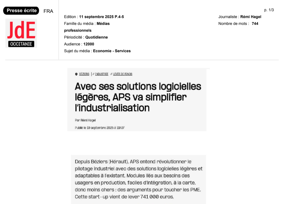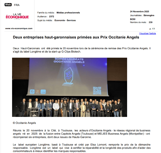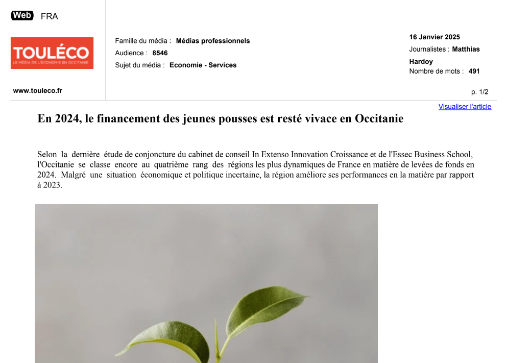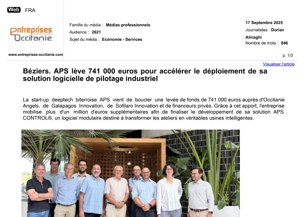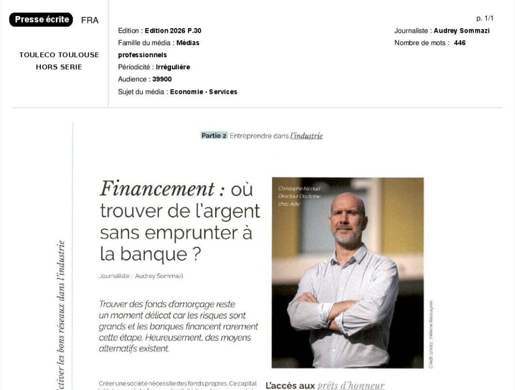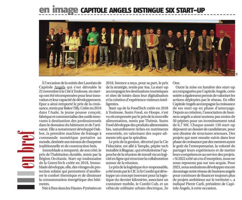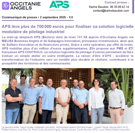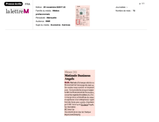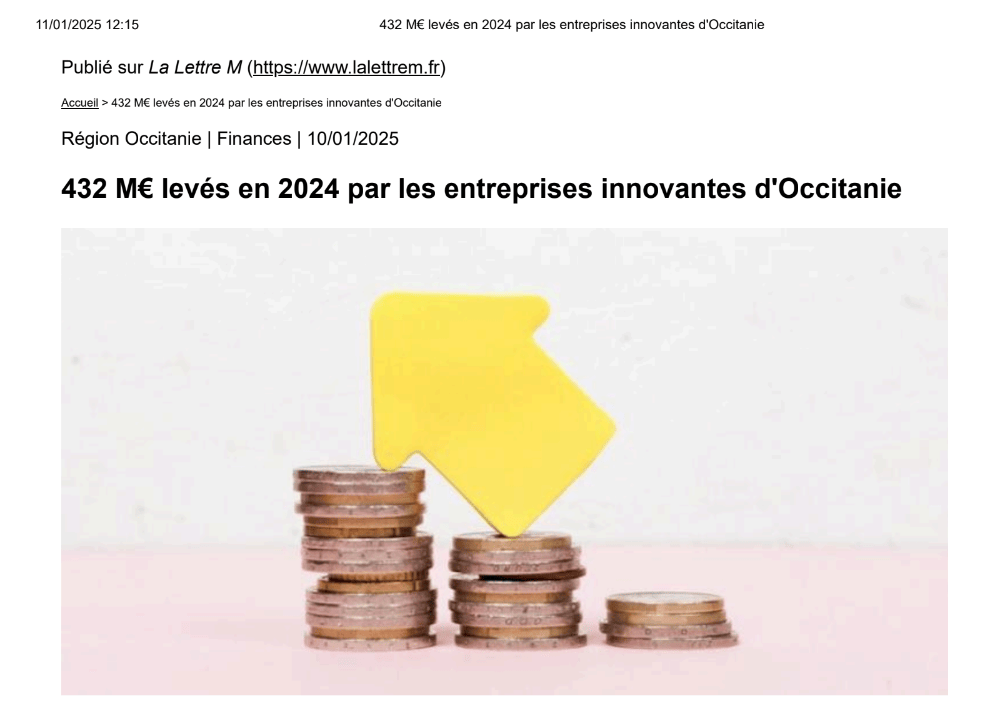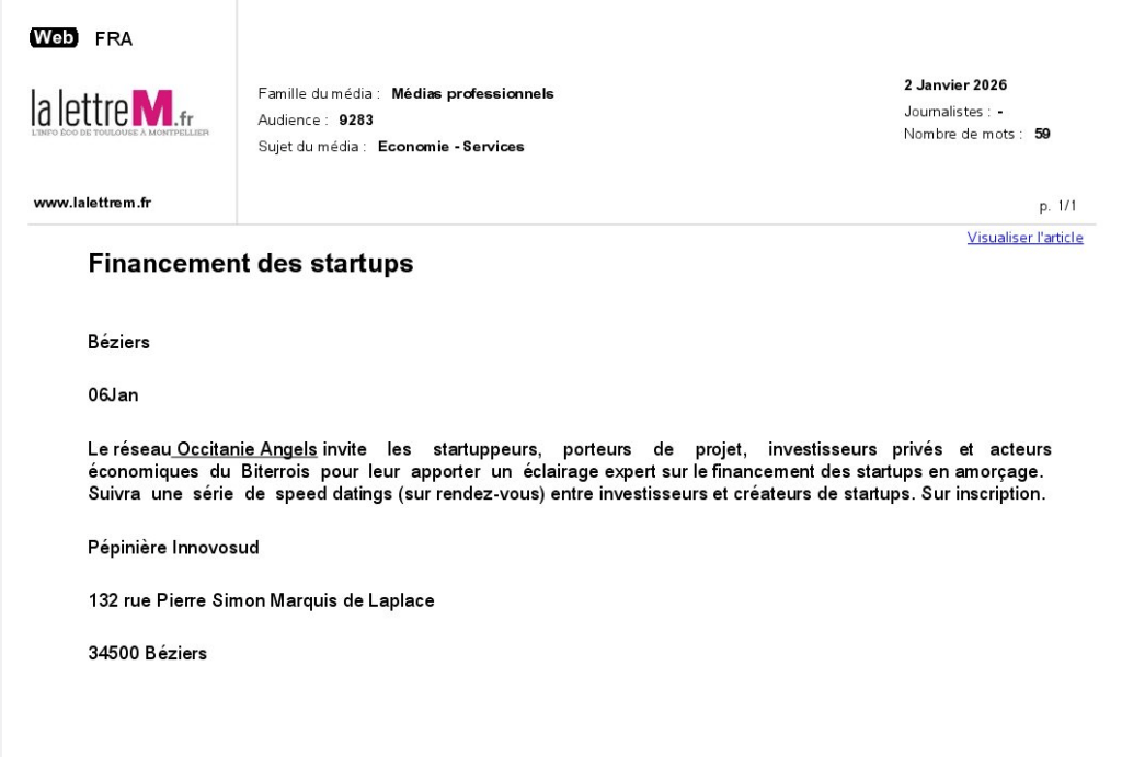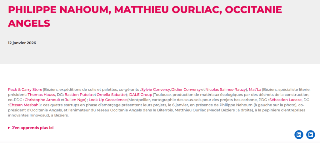 La presse parle de nous Le 19/03/2026 - Aerospace Angels vise le cap des 100 membres en 2027 - La lettre M Le 03/03/2026 - Philippe Nahoum (Occitanie Angels) passe au shaker à ID - La lettre M Le 22/02/2026 - Occitanie Angels veut investir plus et mieux dans les jeunes pousses régionales - Touléco Le 12/02/2026 - Pierre Carli - La Lettre M Le 10/02/2026 - Face à la raréfaction des financements, Occitanie Angels se positionne comme un acteur clé du soutien aux startups - la Gazette du Midi Le 10/02/2026 - Occitanie Angels consolide sa fusion et vise 2 M d'euros investis en 2026 - Entreprises Occitanie Le 09/02/2026 - Occitanie Angels veut d'investir 2 M d'euros dans les startups locales en 2026- La Vie Economique Le 06/02/2026 - Occitanie Angels prévoit d'investir 2 M d'euros en 2026 pour soutenir les startups - Le Journal des Entreprises Le 05/02/2026 - Communiqué de presse Le 15/01/2026 - Occitanie : Matinale Occitanie Angels à Béziers pour dynamiser le seed régional- MMT Le 01/2026 - Pierre Carli - La Lettre M Le 01/2026 - Philippe Nahoum - La Lettre M Le 12/01/2026 - Philippe Nahoum, Matthieu Ourliac, Occitanie Angels - Les Indiscretions Le 06/01/2026 - Edition locale du mardi 06 janvier 2026 - RCF Radio Le 04/01/2026 - Occitanie Angels veut étendre son réseau territorial - La Lettre M Le 02/01/2026 - Financement: où trouver de l'argent sans emprunter à la banque ? - TOULECO TOULOUSE Le 02/01/2026 - Occitanie Angels : startups et investisseurs réunis à Béziers autour du financement de l'innovation - Herault Tribune Le 02/01/2026 - Financement des startups - La Lettre M Le 01/01/2026 - Béziers, Matinale Business Angels à Innovosud le 6 janvier - Occitanie Tribune Le 29/12/2025 - Communiqué de Presse Le 04/12/2025 - Ça se murmure... - La Lettre M Le 27/11/2025 - Capital d’amorçage : à l’aube d’une nouvelle ère, Occitanie Angels affiche ses fortes ambitions - La Gazette du Midi Le 26/11/2025 - Occitanie Angels : les business angels gardois réunis au BIC Innov’up pour soutenir le financement de l’innovation - Le Réveil du Midi Le 25/11/2025 - L'entreprise d'Occitanie Est à l'honneur - La Lettre M Le 25/11/2025 - Matinale des Business angels à Nîmes - La Lettre M Le 25/11/2025 - « Deux startups de Haute-Garonne récompensées par les Prix Occitanie Angels – Le succès économique en Occitanie » - Entreprendre Culture Occitanie Le 25/11/2025 - L'éco d'ici, ICI Gard Lozère Le 24/11/2025 - Deux entreprises haut-garonnaises primées aux Prix Occitanie Angels - La Vie Economique Le 24/11/2025 - Occitanie Angels récompense 6 startups régionales - Le Journal des Entreprises Le 22/11/2025 - NÎMES Une matinale « Business Angels » - Objectif Gard Le 21/11/2025 - Occitanie Angels : 6 pépites de l'innovation récompensées à Toulouse - Occitanie Tribune Le 21/11/2025 - Occitanie Angels célèbre ses Lauréats 2025 et affirme son nouveau rôle régional - Entreprises Occitanie Le 21/11/2025 - Avec 200 investisseurs individuels, Occitanie Angels veut étendre son réseau territorial - La Lettre M Le 21/11/2025 - Occitanie Angels : 6 pépites de l'innovation récompensées à Toulouse - Occitanie Tribune Le 21/11/2025 - Soirée Lauréats 2025 - Communiqué de presse Matinale Business Angels - La lettre M Start-up - La Gazette de Nîmes Le 17/11/2025 - Matinale Business Angels à Nîmes le 25 novembre 2025 - Communiqué de presse Le 17/09/2025 - Béziers. APS lève 741 000 euros pour accélérer le déploiement de sa solution logicielle de pilotage industriel - Entreprises Occitanie Le 10/09/2025 - Avec ses solutions logicielles légères, APS va simplifier l'industrialisation - JDE Occitanie Le 10/09/2025 - Avec ses solutions logicielles légères, APS va simplifier l'industrialisation - Le Journal des Entreprises Le 03/09/2025 - Capitole Angels et MELIES créent Occitanie Angels - Le Journal des Entreprises Le 03/09/2025 - La start-up biterroise APS lève 700 k€ pour déployer son outil de pilotage industriel - La Lettre M Le 02/09/2025 - Communiqué de presse Occitanie Angels x APS Le 16/07/2025 - Pierre CARLI : "Occitanie. Start-up : Capitole Angels et Melies Business Angels fusionnent pour devenir Occitanie Angels" - actu.fr Le 15/07/2025 - Pierre CARLI : "Les business angels sont d'abord passionés par l'entrepreneuriat" - La Lettre M Le 01/07/2025 - Le haut garonnais Capitole Angels et le Montpelliérain MELIES fusionnent pour devenir Occitanie Angels,, basée à Montpellier - FIRST ECO Le 01/07/2025 - Occitanie Angels : Capitole Angels et MELIES fusionnent - www.vie-economique.com Le 30/06/2025 - Naissance d'un géant régional de l'investissement : Capitole Angels et MELIES fusionnent pour devenir Occitanie Angels - Entreprises Occitanie Le 30/06/2025 - Pierre Carli, Philippe Nahoum, Occitanie Angels - Les Indiscretions Le 30/06/2025 - Capitole Angels et MELIES fusionnent pour devenir Occitanie Angels - Le Journal des Entreprises Le 29/06/2025 - Naissance d'un géant régional de l'investissement : Capitole Angels et MELIES fusionnent pour devenir Occitanie Angelss - Entreprises Occitanie Le 27/06/2025 - Capitole Angels et MELIES Business Angels fusionnent pour devenir Occitanie Angels - www.tvlocale.fr Le 27/06/2025 - Communiqué de presse Occitanie Angels Le 27/05/2025 - Pierre CARLI - La Lettre M Le 25/05/2025 - Après les JO, la start-up I-Percut vise de nouveaux sommets - La Dépêche Le 22/05/2025 - Basé à Ramonville-Saint-Agne, Capitole Angels ambitionne de réaliser 700K€ d'investissements d'ici fin 2025 - First Eco Le 21/05/2025 - I-Percut boucle une levée de fonds de 300 K€ pour conquérir le marché du fitness et l'Europe - la Gazette du Midi Le 20/05/2025 - Une carte de visite connectée pour réseauter - Aujourd'hui en France Le 09/05/2025 - "C'est risqué", à Toulouse des dirigeants d'entreprises investissent dans des start-ups pour qu'elles se développent - Ici occitanie Le 09/05/2025 - WeMet. Une levée pour continuer